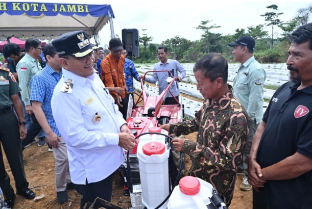 Kota Jambi - Wali Kota Jambi, Dr.dr. H. Maulana, M.K.M, menyerahkan bantuan Alat dan Mesin Pertanian (Alsintan) yang merupakan bantuan Kementerian Pertanian Republik Indonesia (RI) Tahun 2025 kepada sejumlah Kelompok Tani dalam wilayah Kota Jambi,
