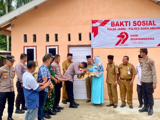 Sarolangun - Ibu Suryani, warga Desa Bernai Dalam Kecamatan Sarolangun (Sosial) Kabupaten Sarolangun, Senin (30/06/2025), merasa terharu bahagia takkala menerima kado terindah Hari Bhayangkara ke-79 dari Kapolres Sarolangun AKBP Budi Prasetya. SIK, M.Si dengan menyerahkan kunci rumah yang baru selesai diperbaiki.