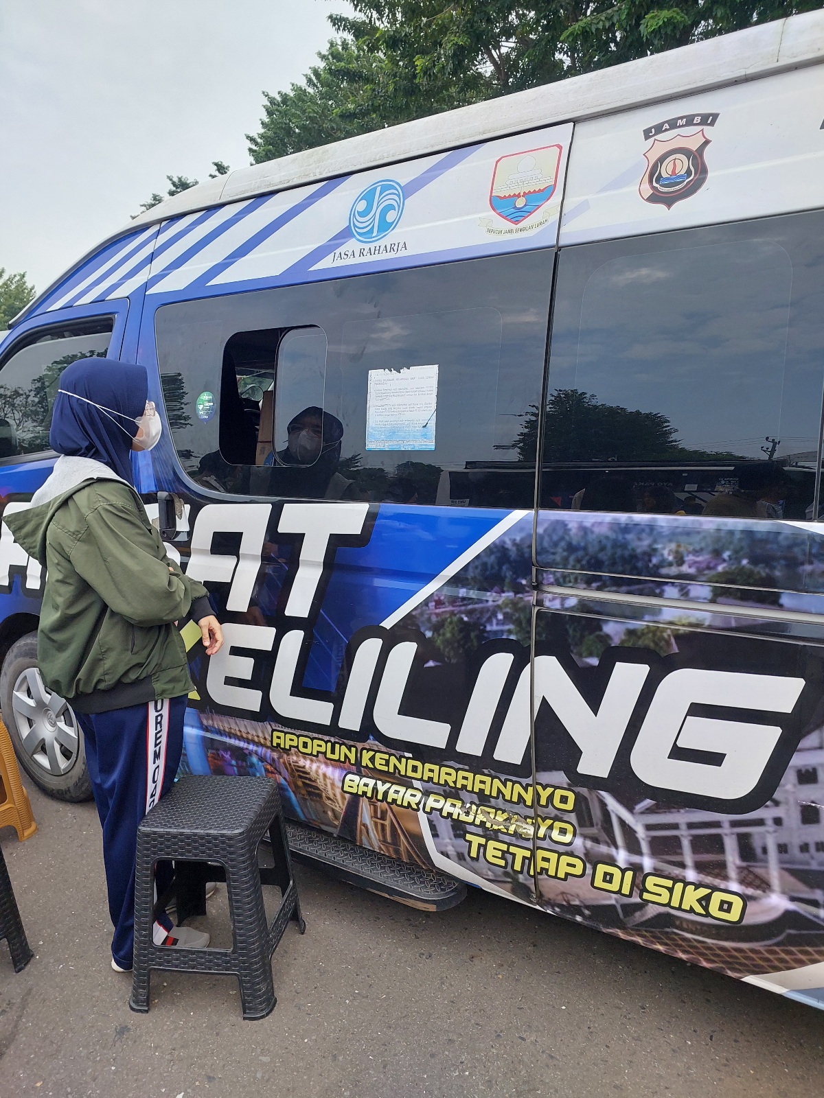 Kota Jambi - Salah satu layanan Car Free Day menyambut Hari Bhayangkara ke-79, yaitu pembayaran pajak tahunan Samsat keliling Ditlantas Polda Jambi, Minggu (22/06/2025) dipelataran Tugu Keris Seginjai Kota Baru, sangat membantu memudahkan masyarakat Kota Jambi membayar pajak kendaraan.