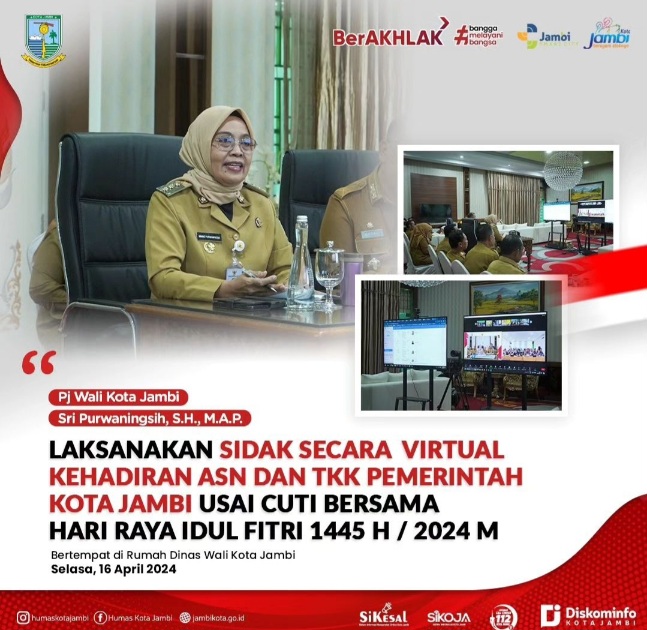 Sri menyampaikan di tahun 2024 ini pasca libur dan cuti bersama Hari Raya Idul Fitri dari total data absensi pegawai Pemerintah Kota Jambi yang telah direkap Badan Kepegawaian dan Pengembangan Sumber Daya Manusia Daerah (BKPSDMD) terdiri dari ASN dan Tenaga Kerja Kontrak (TKK) direkapitulasi sebesar 97,6% kehadiran tepat waktu.