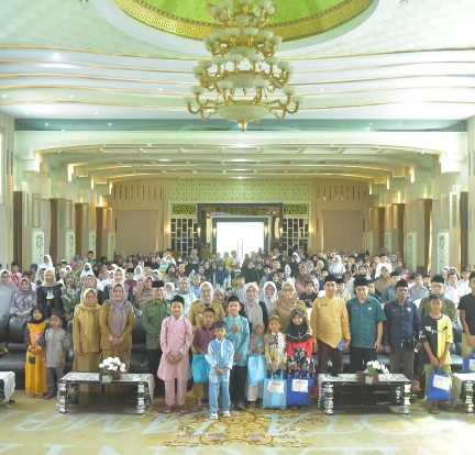 Tampak saat Penjabat (Pj) Wali Kota Jambi Sri Purwaningsih didampingi Syamsir Naim Ketua Baznas Kota Jambi menyalurkan santunan bagi Anak Yatim/Dhuafa, bertempat di Aula Griya Mayang rumah dinas Walikota.