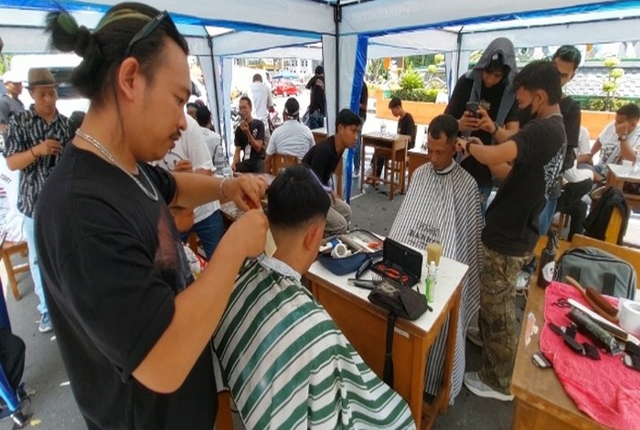 "Hampir 70 orang, beberapa orang dari luar kota ini kegiatan sosial peduli Palestina, peduli kemanusian kami tandem dengan yang lain potong rambut seganteng mungkin bayar sukarela didonasi seratus persen untuk palestina," katanya